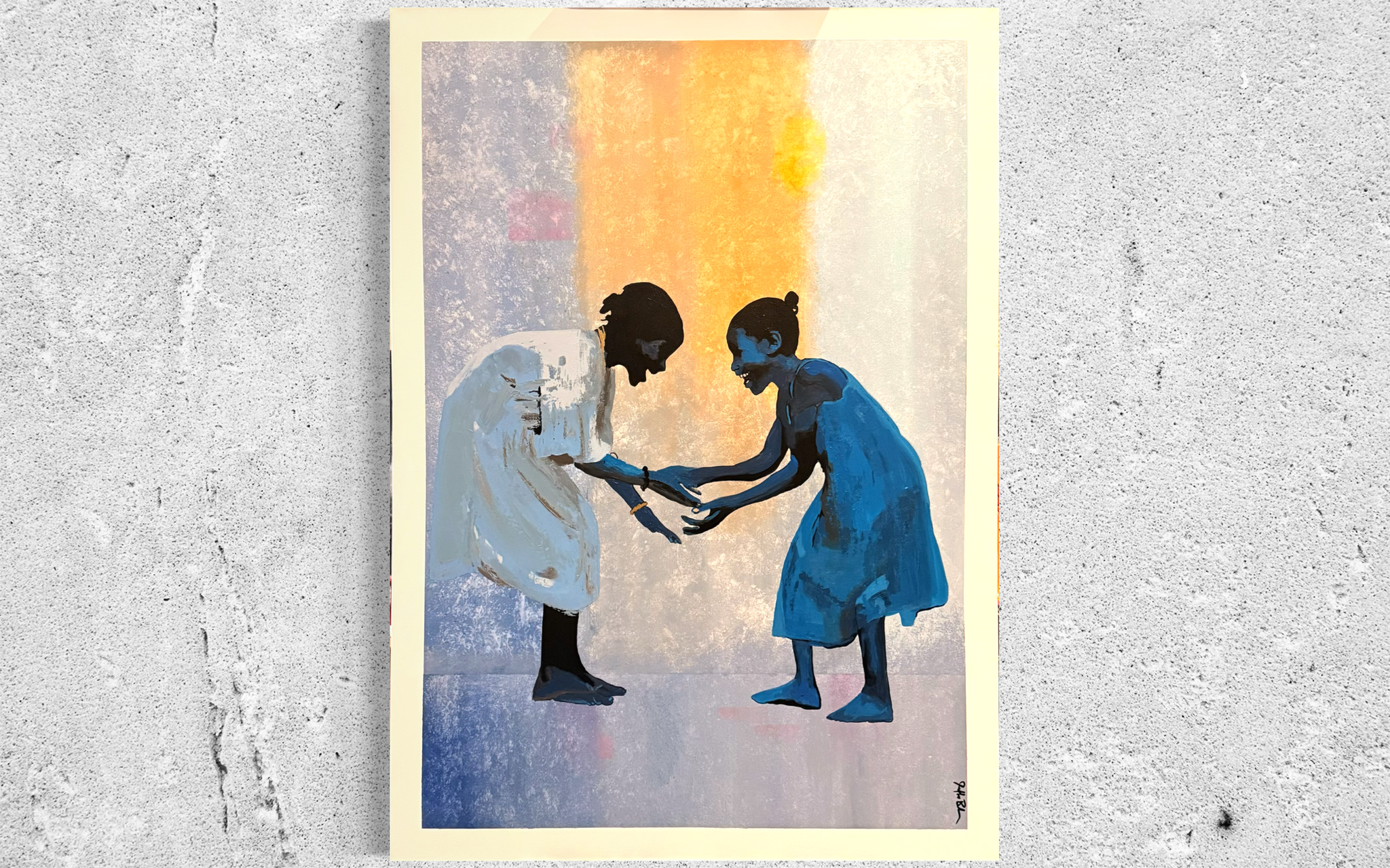 Rendered in layered blues and soft, textured neutrals, the composition evokes calm, reflection, and emotional depth. The figures are grounded yet luminous, suggesting that faith is both weight and gift, something carried, shared, and nurtured through connection. The subtle glow between them symbolizes hope, grace, and the unseen strength that sustains us through life’s transitions.